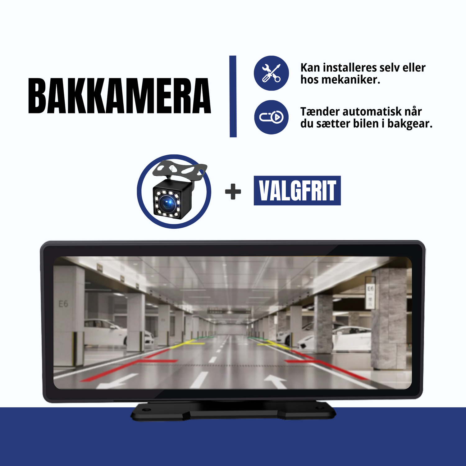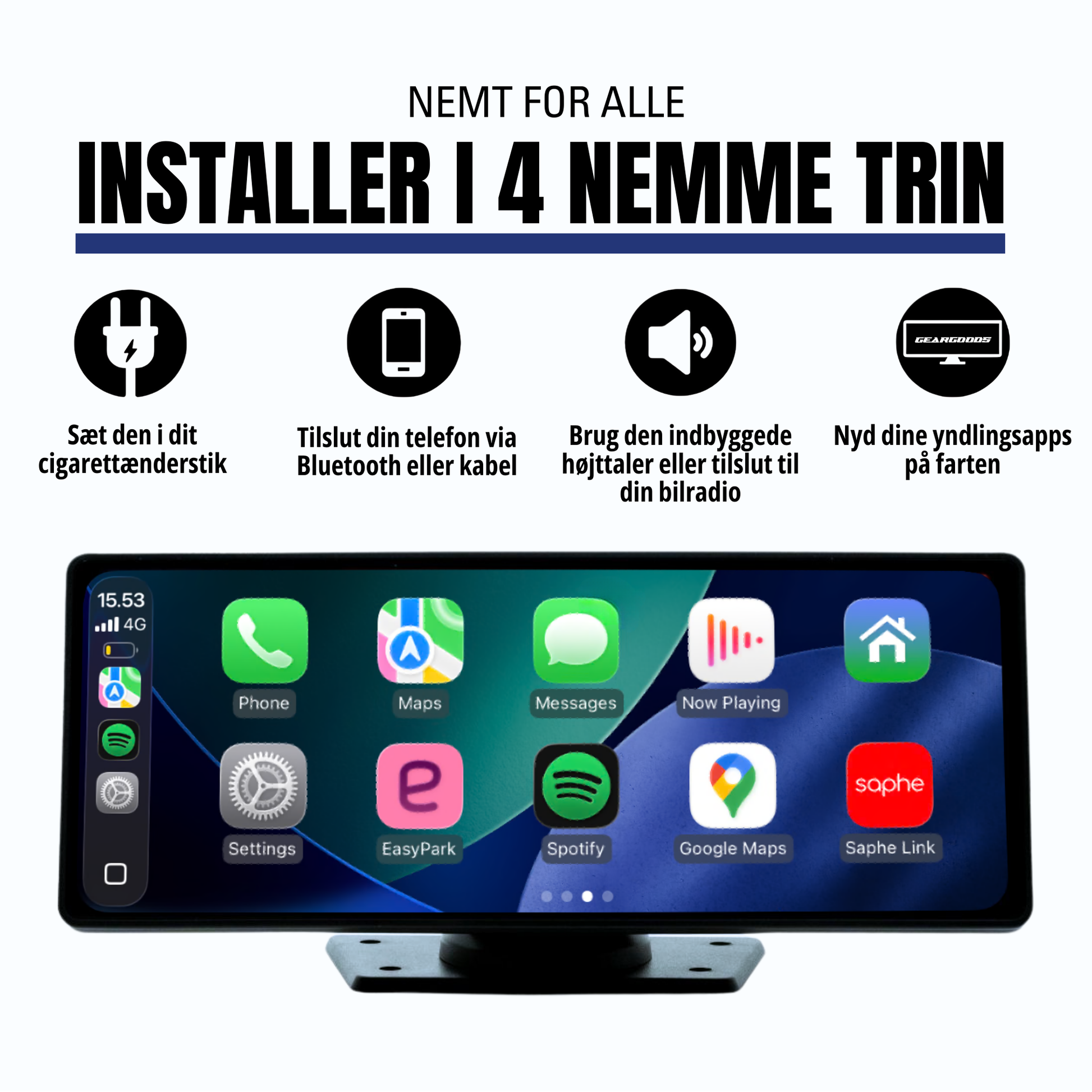 Skærmen monteres nemt med sugekop eller klæbebase og tilsluttes via cigarettænderen. Ingen indgreb i bilens ledninger. Passer til næsten alle biler med 12–36 V og kan nemt flyttes mellem biler, leasing og firmabiler.